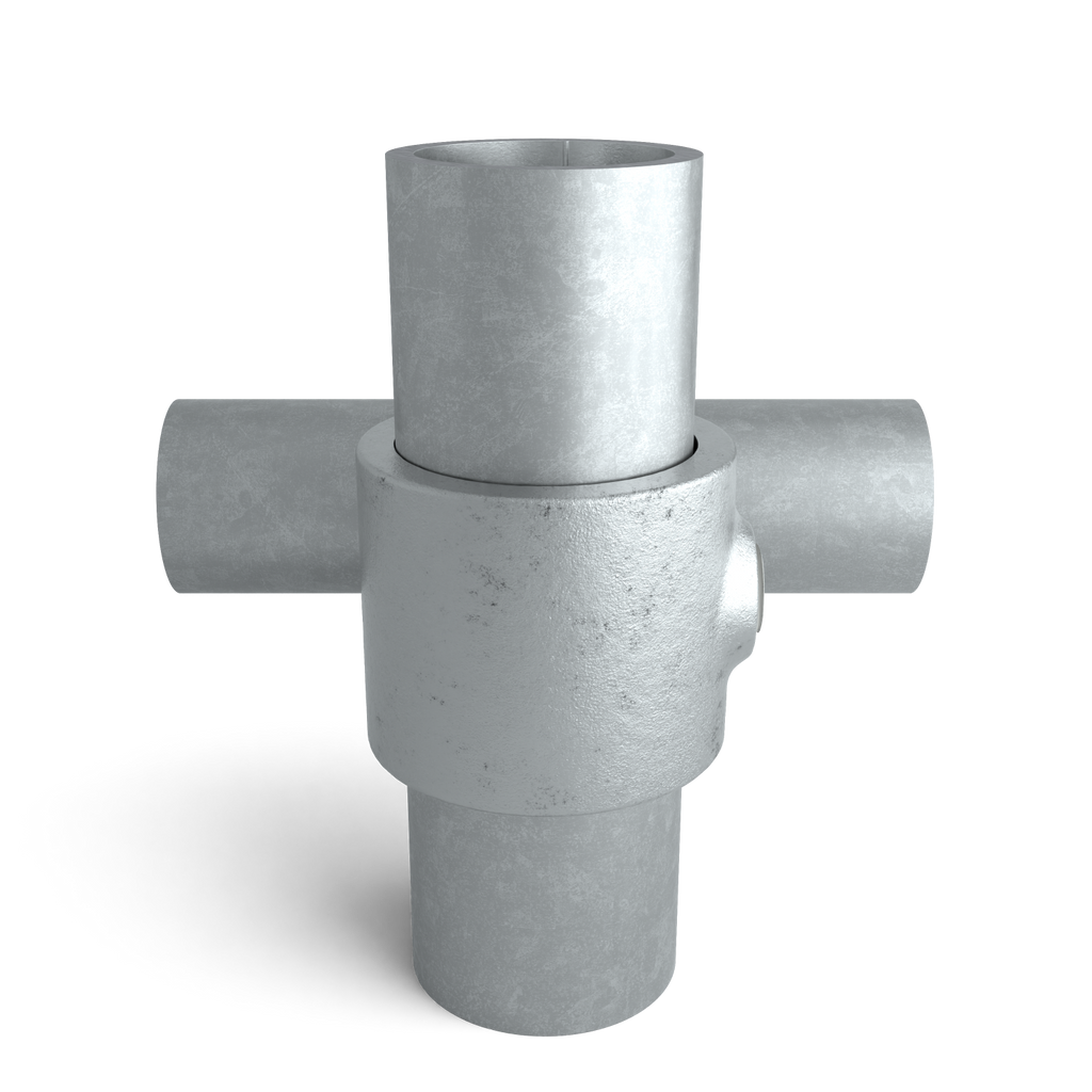 De buiskoppeling Kruisstuk 90° met verloop wordt gebruikt om twee steigerbuizen van verschillende diameter haaks (90°) met elkaar te verbinden. Beide buizen blijven daarbij doorlopend en kruisen elkaar zonder onderbreking, wat zorgt voor minder zaagkosten en behoud van constructieve sterkte.