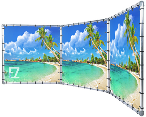 Presentatiewand Vario, uitermate geschikt als beursstand die snel op te bouwen is. Dit beursframe is zeer duurzaam en geschikt voor zowel binnen- als buitengebruik. De beurswand heeft een strak geheel omdat wij met stormfix elastieken werken. Deze zorgen ervoor dat er slechts 2-4 cm ruimte tussen het spandoek en de buizen zit. In tegenstelling tot de Presentatiewand Triple zijn de hoeken van deze variant wel variabel in te stellen van 90° tot 270°.