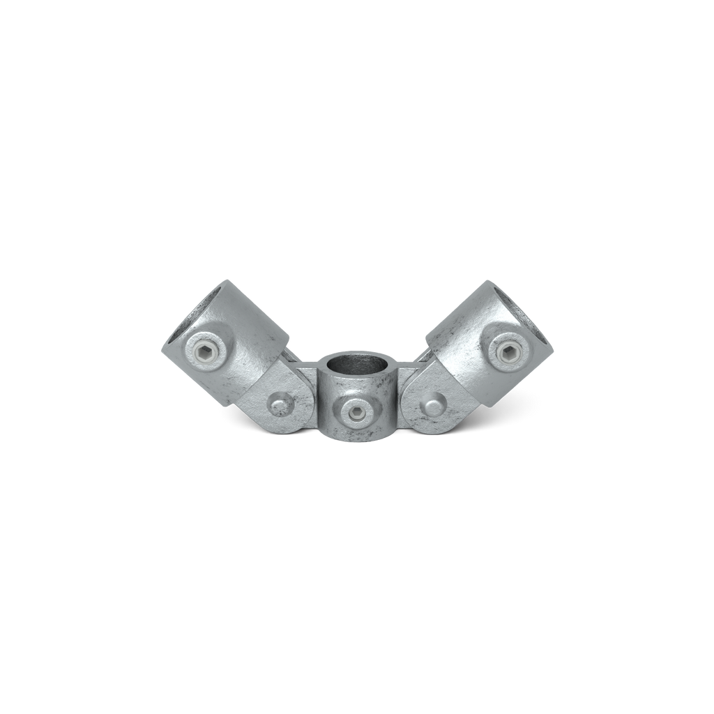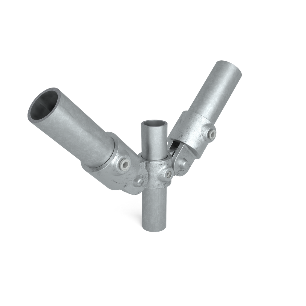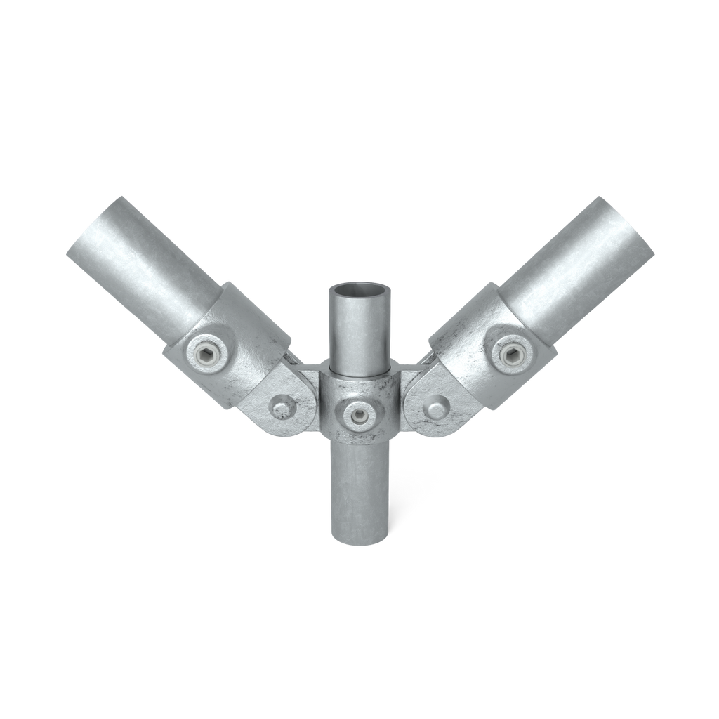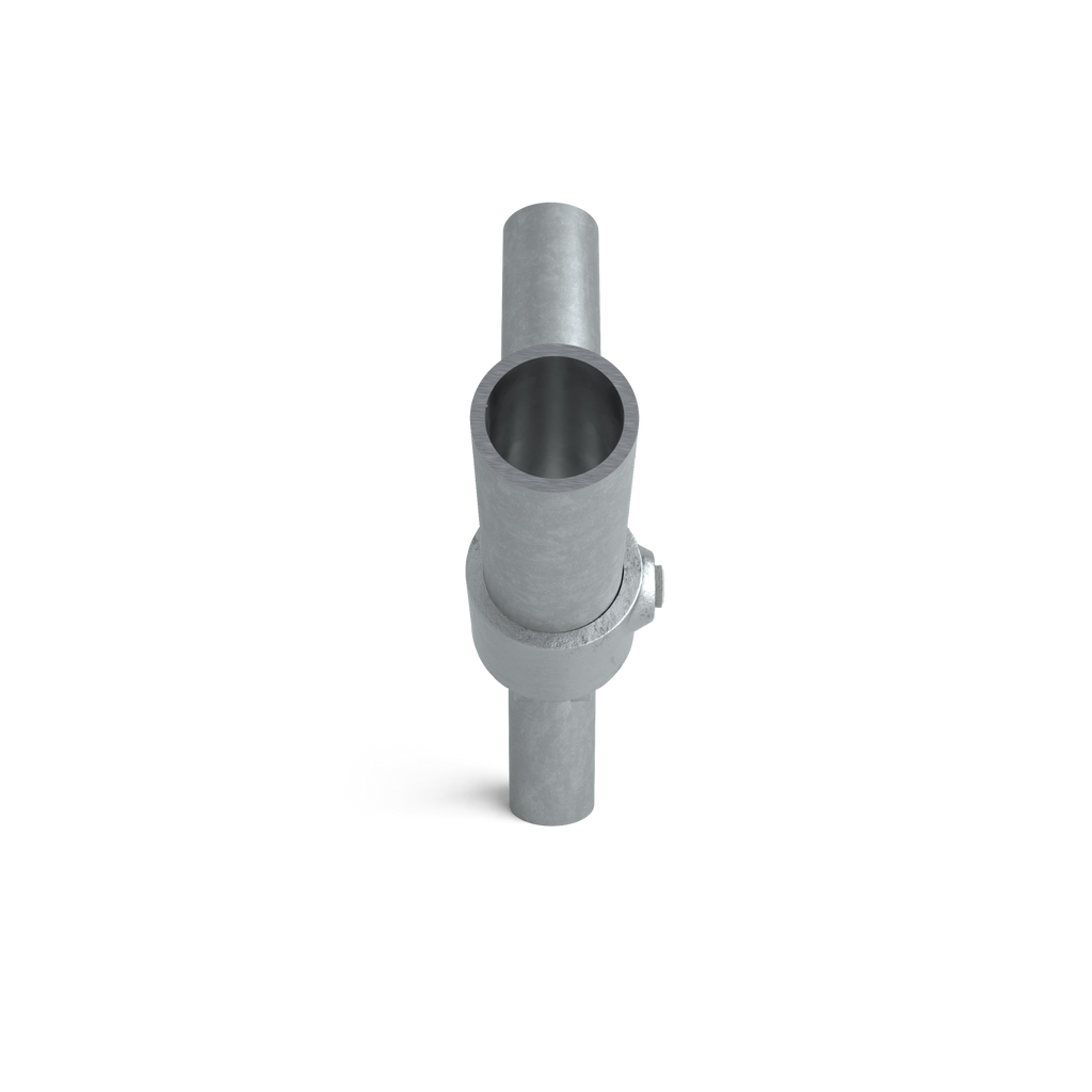 Het dubbele scharnierstuk is een complete scharnierkoppeling waarbij twee scharnierpunten zijn gecombineerd aan één doorlopende steigerbuis. Hierdoor kunnen twee buizen onafhankelijk van elkaar draaibaar worden gemonteerd aan dezelfde hoofdbuis.