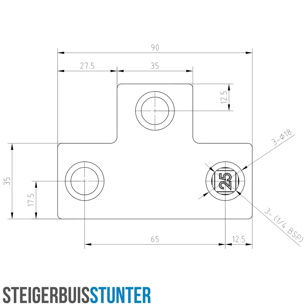 T-stuk lang zwart 25 mm vierkant